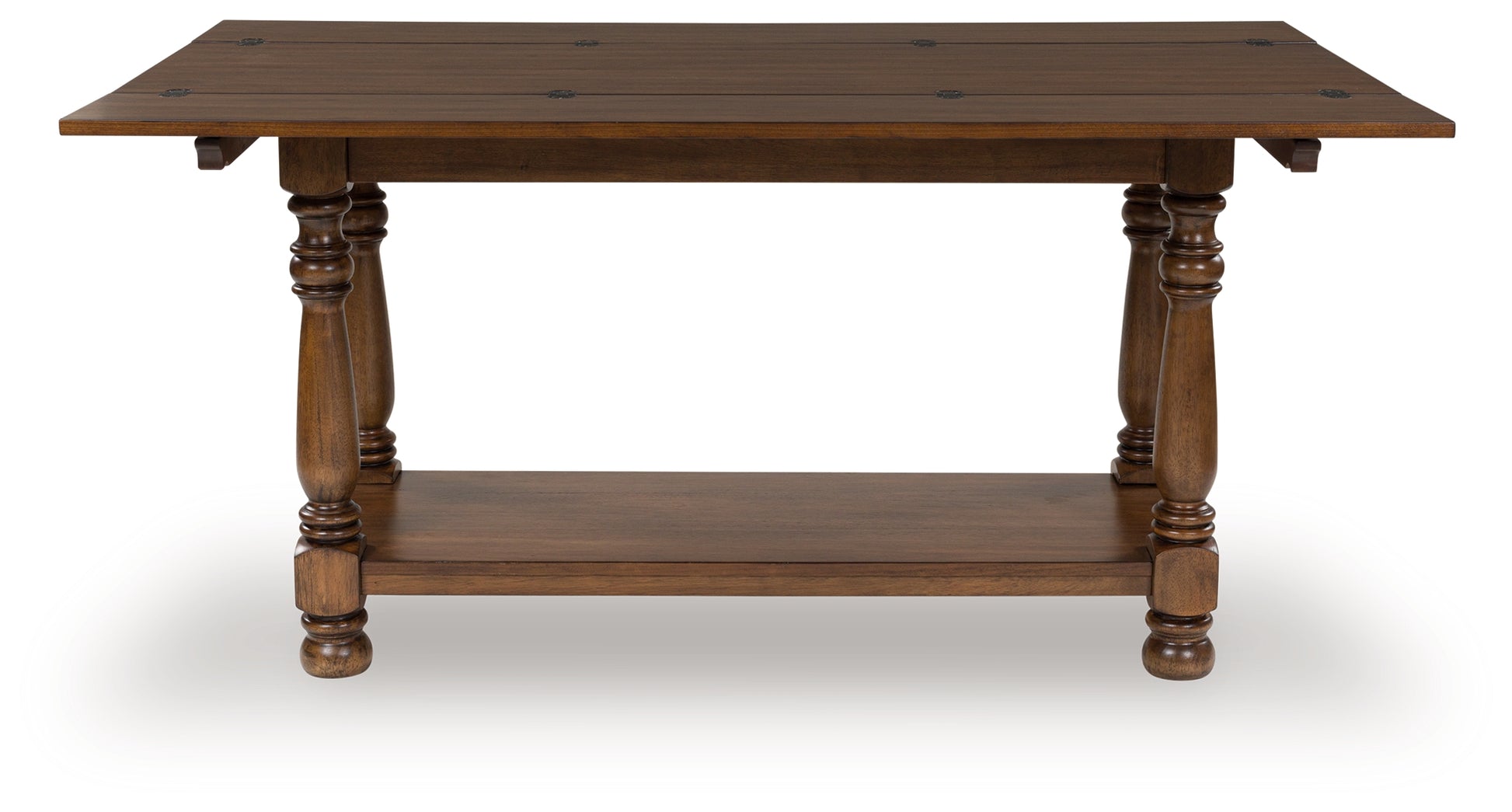 • Traditional style doesn’t have to be stuffy. It can feel warm, inviting and beautifully in the moment. Case in point: the Sturlayne flip-top sofa table. Showcasing uniquely detailed leg posts, it has an allure all its own. Equally special is the rich brown finish, which exudes a mood of timeless charm. And when you need an extra dining space, simply fold open the table's hinged panels. How's that for relaxed refinement?