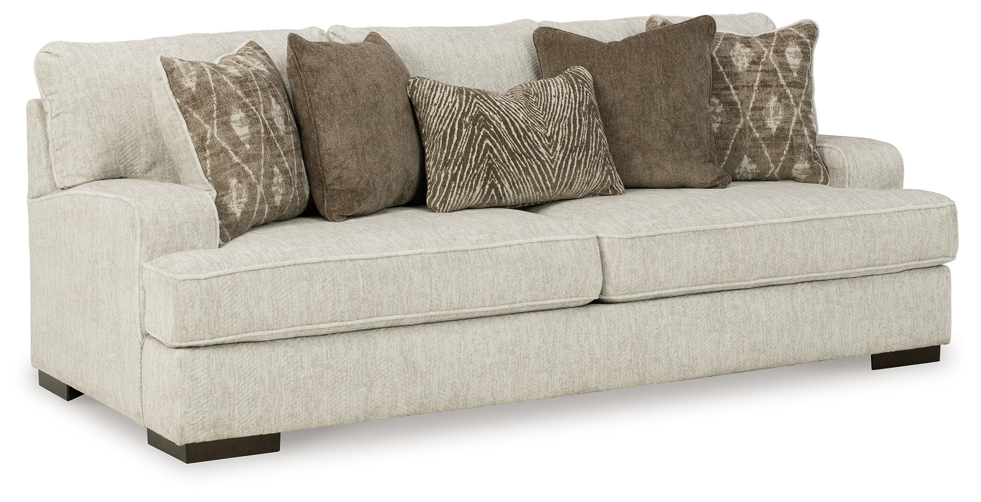 Decidedly modern with a sense of relaxed ease, the Alesandra sofa looks at home in so many different places and spaces. Providing a highly distinctive look: substantial track arms with curved cornering, wrapped t-cushions and low-to-the-floor block feet in a warm wood-tone finish. Sporting a subtle chevron texture, the parchment-tone upholstery takes neutral to new heights.