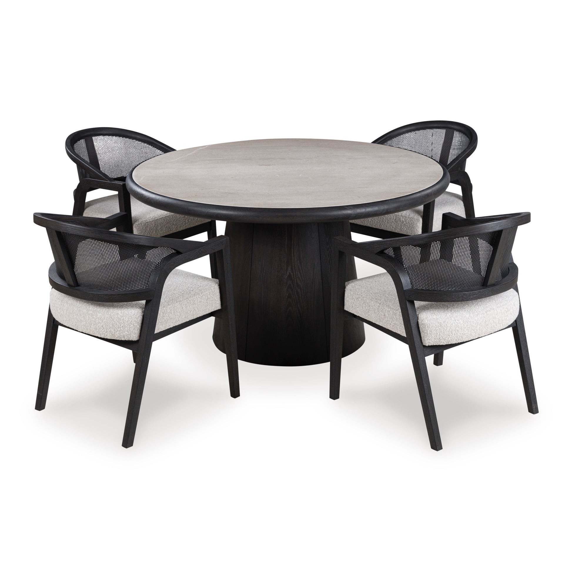 Clean-lined silhouettes and natural materials are harmoniously paired in the Bracken dining table set. Its elegant marble inlay top and versatile neutral palette reflect an expert blend of authentic charm and contemporary flair. A beautiful blend of rustic style and refined design, it’s an artfully crafted approach to modern aesthetics.