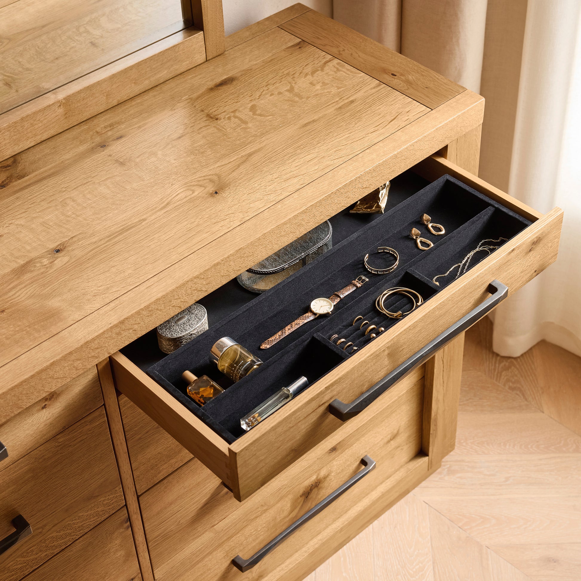 Clean-lined silhouettes and natural materials are harmoniously paired in the Bracken Bedroom Package. A French oak finish enhances the wood's timeless character, while dark charcoal upholstery adds chic contrast. With artisanal style and refined design, this bed is an artfully crafted approach to modern aesthetics.